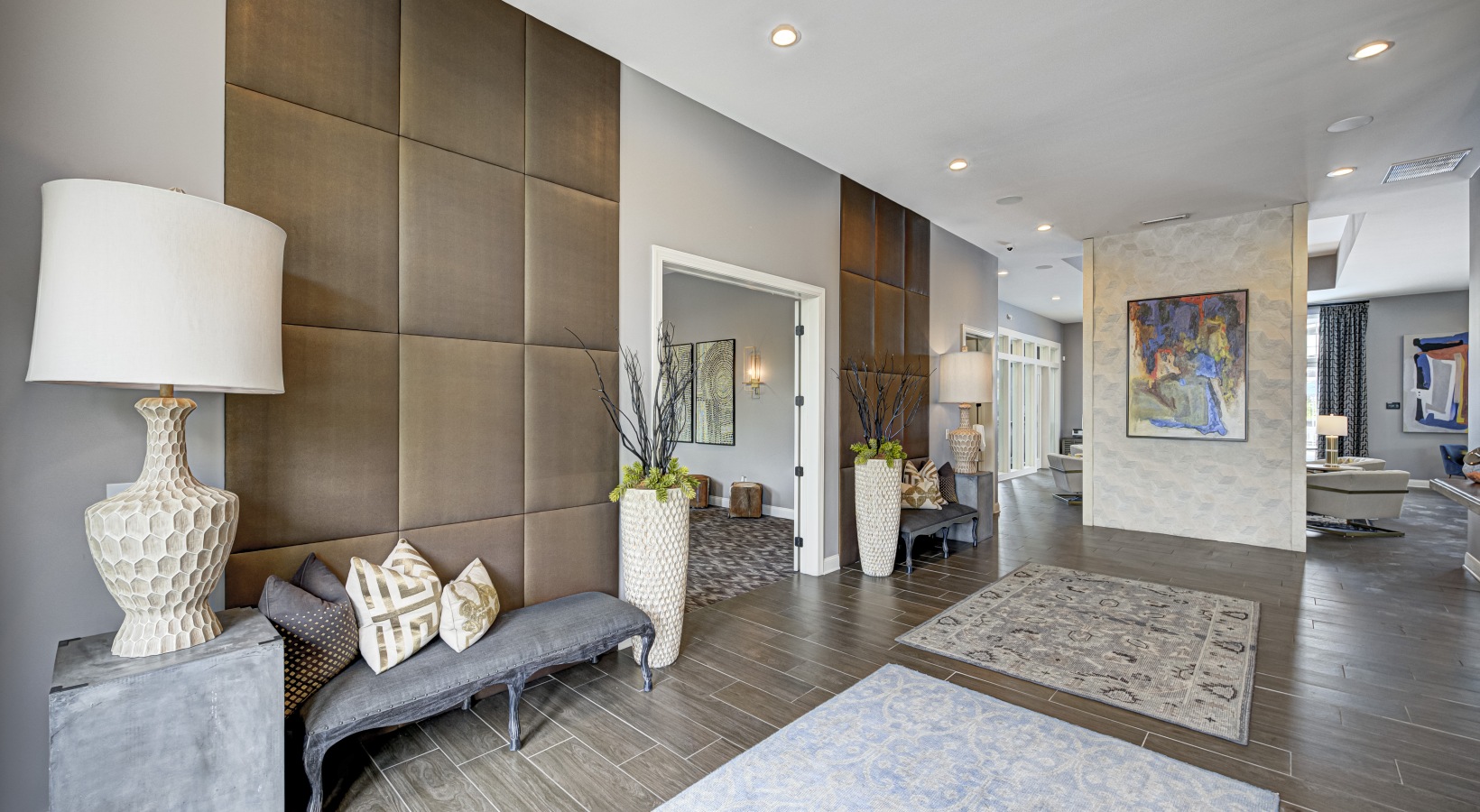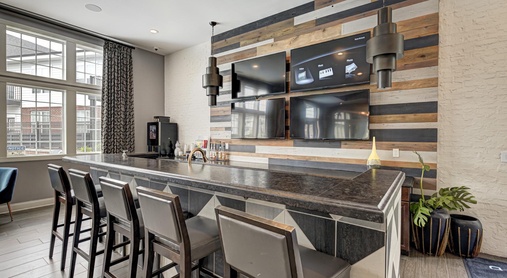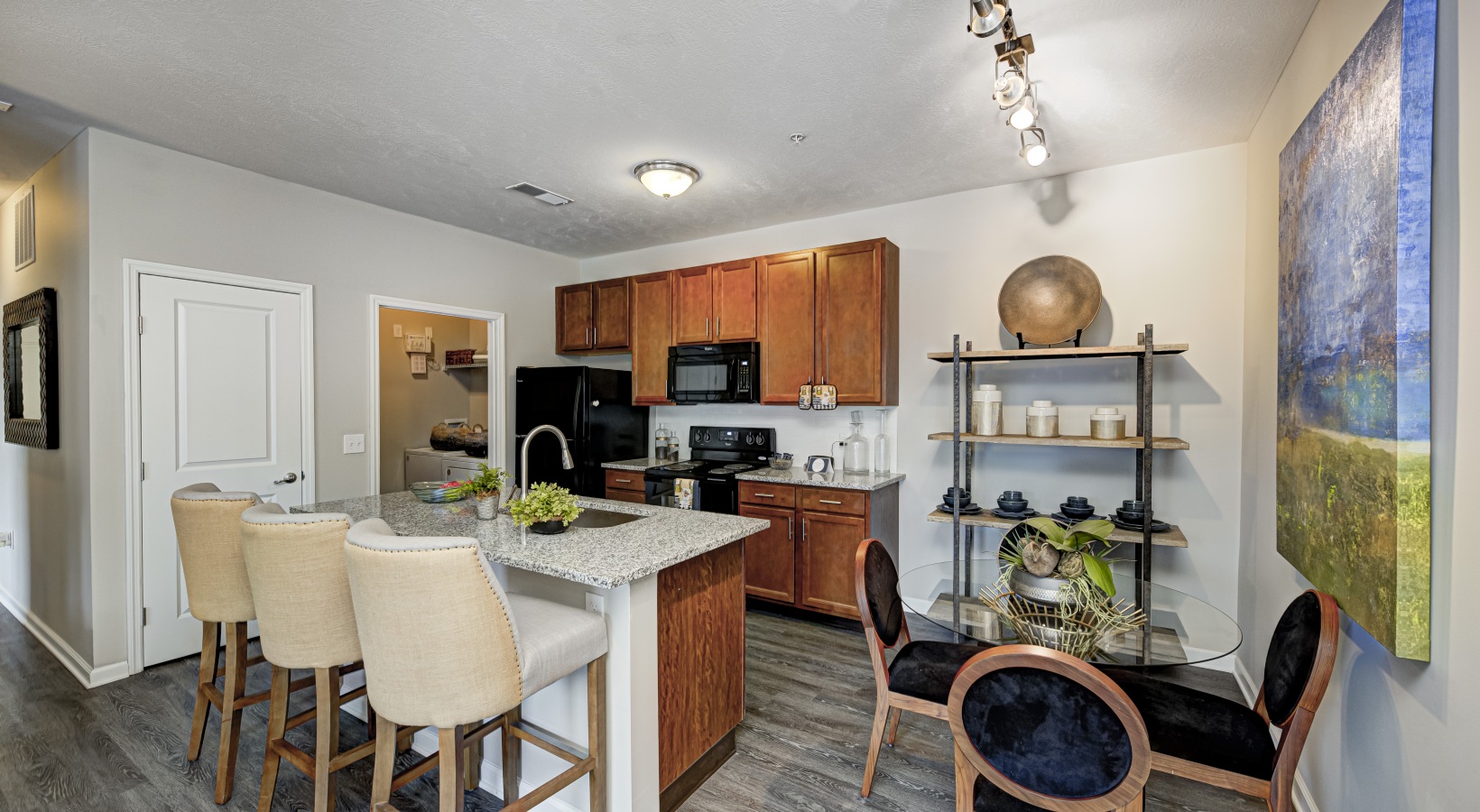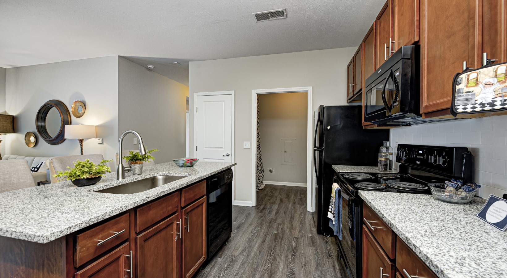 • Kitchen with brown cabinets and tan countertops and black utilities